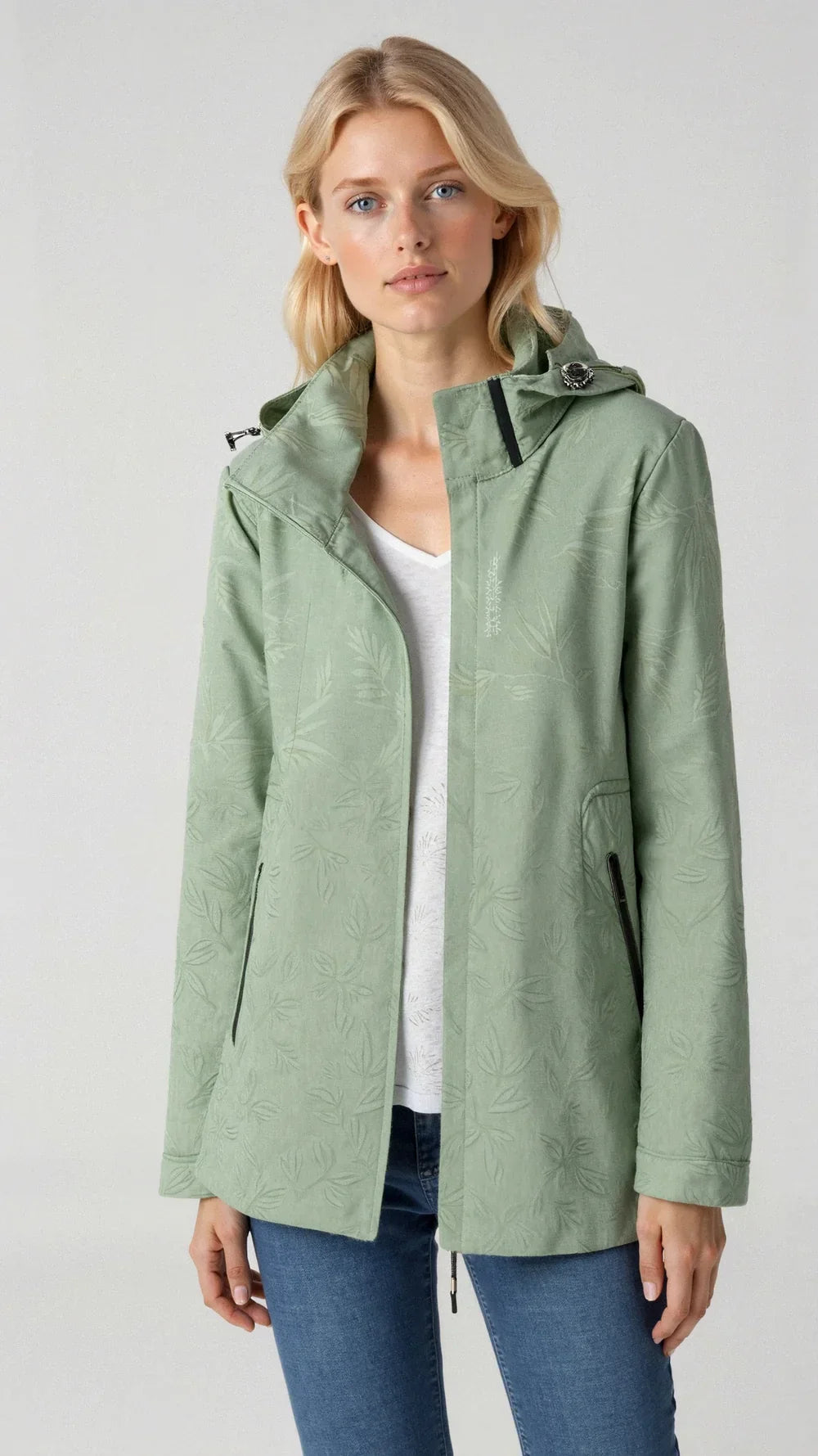 Ta damska lekka kurtka wodoodporna z kapturem i wzorem to niezawodna ochrona w deszczowe dni. Stylowy wzór i funkcjonalne detale sprawiają, że poczujesz się modnie i komfortowo niezależnie od pogody.