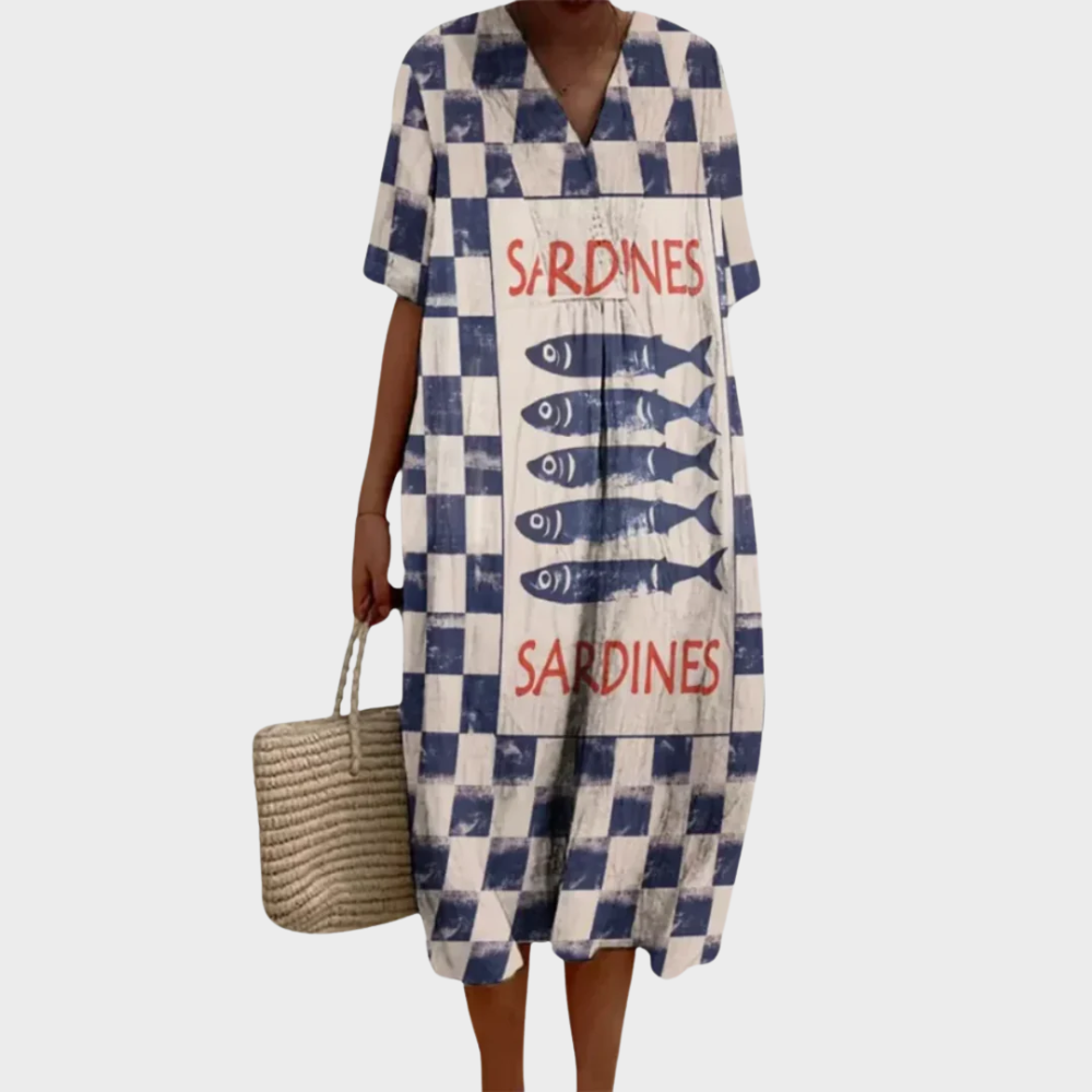 Ze swoim stonowanym nadrukiem i eleganckim wyglądem, sukienka staje się niezastąpionym elementem letniej garderoby. Sprawdzi się zarówno podczas nadmorskich spacerów, jak i w czasie codziennych, luźnych spotkań. Jej prosty, graficzny design sprawia, że łatwo ją stylizować na wiele sposobów.