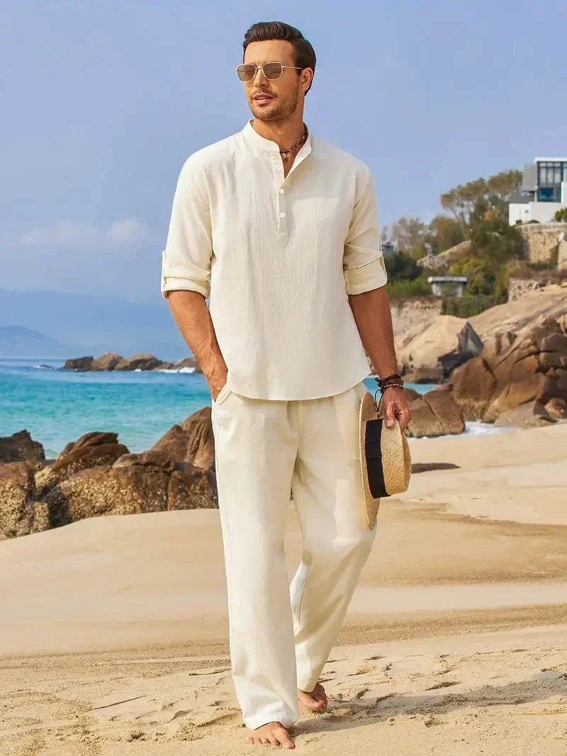 Ten męski lniany zestaw to połączenie klasy i wygody – koszula z długim rękawem oraz luźne spodnie tworzą stylową całość, która sprawdzi się w każdej letniej sytuacji. Naturalny len zapewnia przewiewność, a nowoczesny krój daje swobodę i styl, gdziekolwiek jesteś.