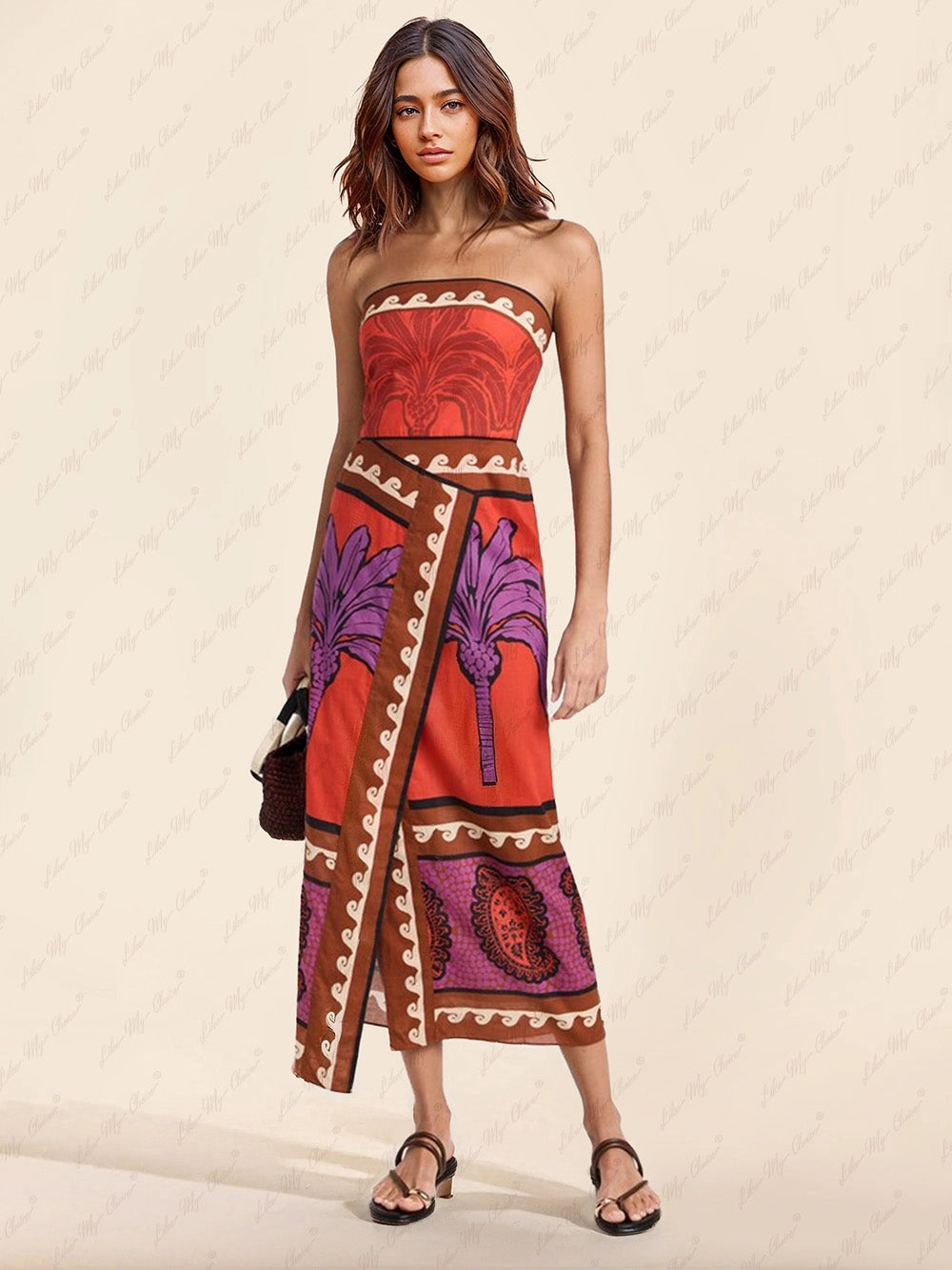 Ta unikalna sukienka midi z odkrytymi ramionami w kwiaty palmowe od LikeMyChoice® jest stylowa i wygodna.