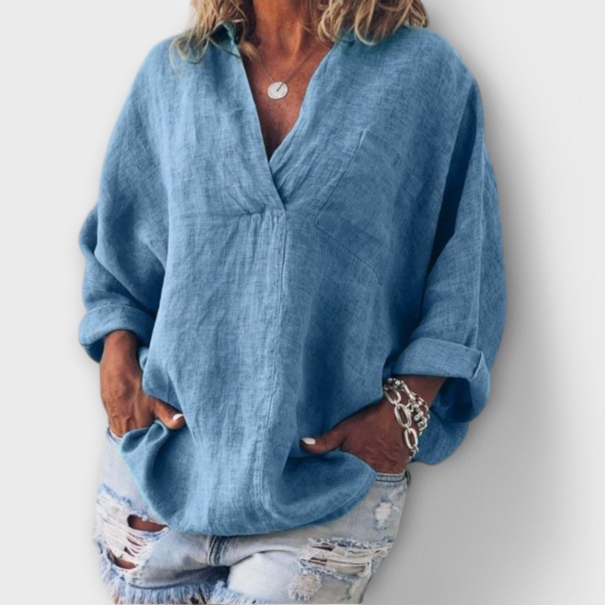 Odkryj styl i elegancję z bluzką RIKARDA, która łączy klasyczny design z nowoczesnymi detalami. Podkreślający sylwetkę dekolt w kształcie V dodaje wyrafinowanego akcentu, podczas gdy lekka i przyjemna tkanina sprawia, że jest idealna zarówno na co dzień, jak i na bardziej formalne okazje.
