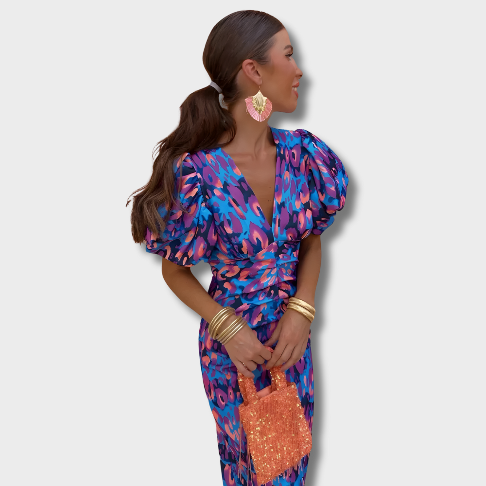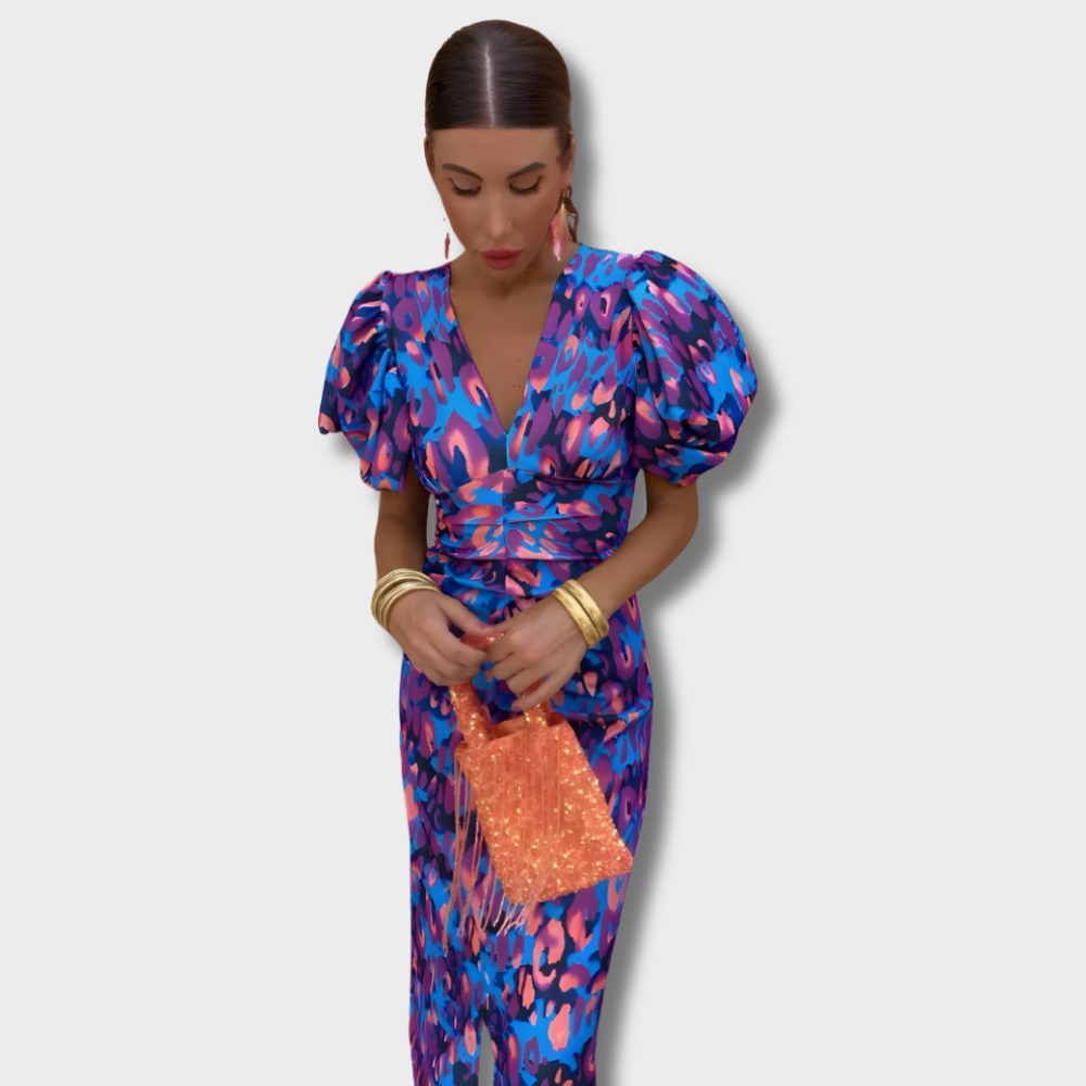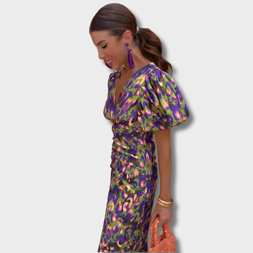 Dodaj odrobinę koloru do swojej garderoby dzięki tej wyjątkowej sukience, która łączy żywe odcienie z elegancko marszczonymi rękawami. Idealna na każdą okazję, od swobodnych spotkań po półformalne uroczystości.