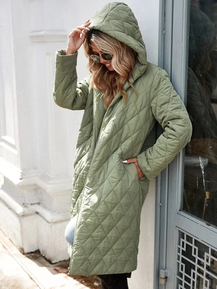 Zielona Kurtka Puchowa Damska Z Kapturem | Długa Pikowana Kurtka Dla Kobiet